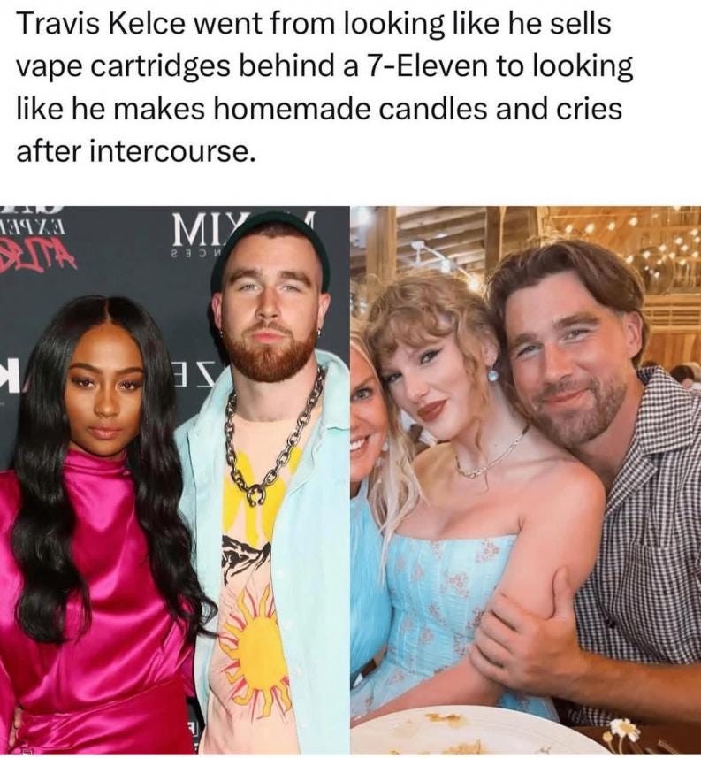 Travis Kelce went from looking as if he sold vape cartridges behind a 7-Eleven to looking as if he made homemade candles and cries after intercourse.