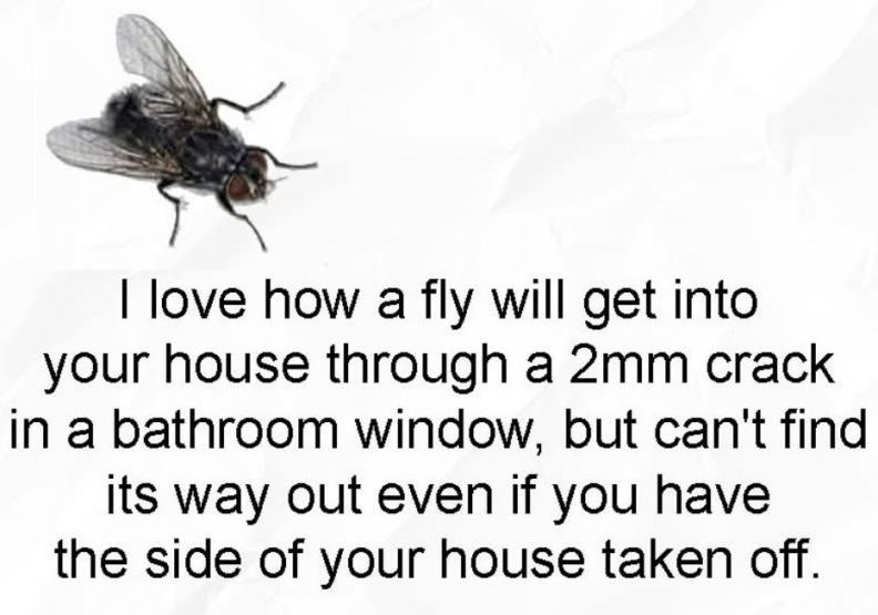 I love how a fly will get into your house through a 2mm crack in a bathroom window, but can’t find its way out even if you have the side of your house taken off.